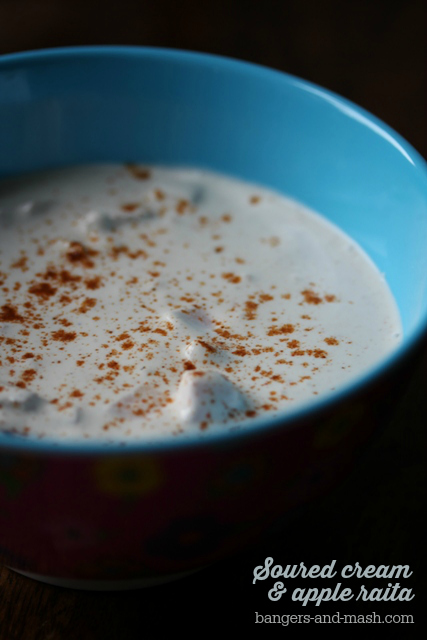 The first is a simple cucumber, mint and tomato raita; fantastically light and refreshing alongside a rich, spicy curry. The second is made with crisp, juicy chunks of apple, a brilliant combination – although I did swap the yoghurt for soured cream in this one, as I ran out of yoghurt, which I believe worked equally well. I’ve never thought of using apple in a raita. Banana perhaps, but not apple. But it really works so well, and I’ll be making this again and again. It was very good the next day in a chicken salad sandwich too.