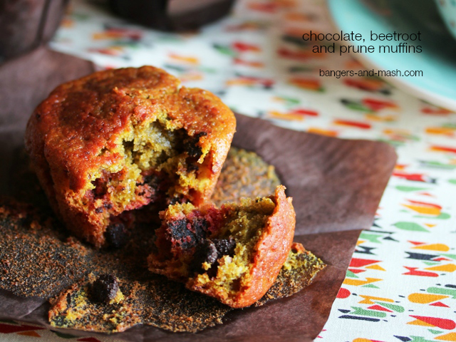 Beetroot and chocolate muffins are a bit of a favourite here and for some reason I was seized by the idea of throwing in some chopped prunes when I baked a batch last week. I know it sounds a bit odd, but it’s good to experiment.