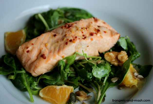 While the salmon is cooking, throw the rocket salad in your lunch box, along with the orange segments, walnuts and mixed seeds. Pop on the lid and place in the fridge.