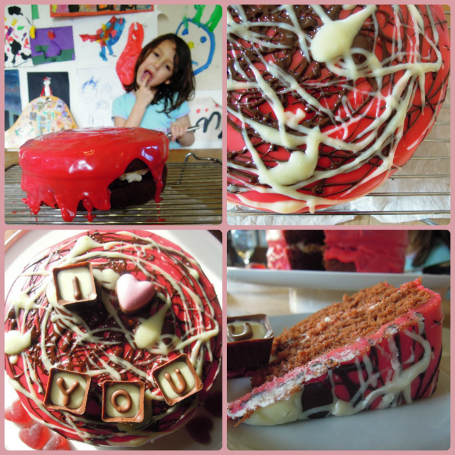 Mia then went to town creating her own Jackson Pollock style artwork, dribbling first melted plain and then white chocolate on top of the cake, and of course all over herself and the floor at the same time. For the final piece de resistance, Mia added some lovely Thornton’s Valentine’s chocolate truffle cups to spell out I heart you on top. We also had a bag of Thornton’s strawberry jelly hearts but Mia decided against using those as well at it might be slightly OTT. You see, she can be quite a discerning child really. Jess and Mia gobbled up the jelly hearts once they finished licking the bowl out, natch.