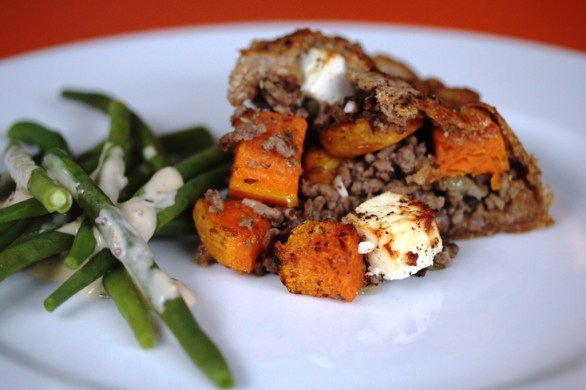 Free-form spelt pie with spicy beef, butternut squash and feta