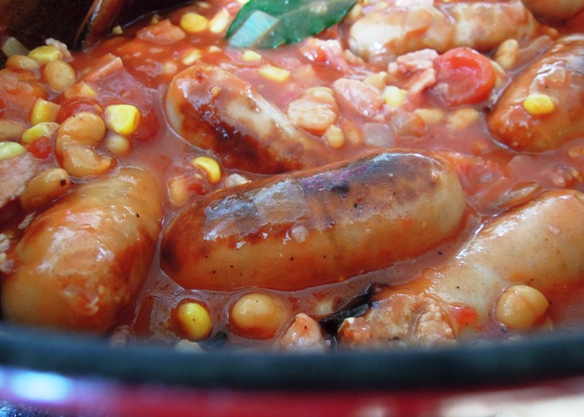 Heat the oil in a large casserole and brown the sausages, then remove to one side. Add the onion and bacon to the casserole and gently brown. Throw the sausages back in, as well as the beans, sweetcorn and tomatoes. Add the bay leaf, season well with salt and pepper and give it all a good mix.