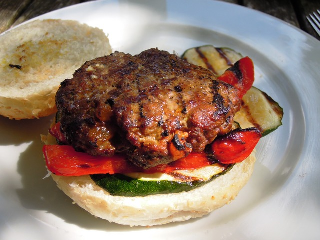 I served my bobotie spiced burgers in sesame seed buns with some chargrilled courgettes and red peppers.
