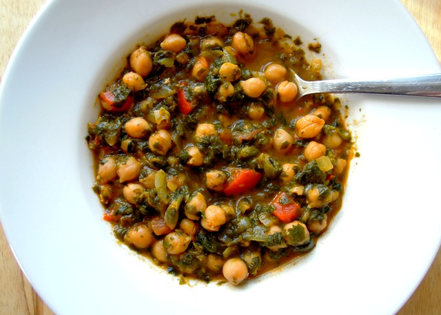 Using a pestle and mortar, crush the saffron and peppercorns with the remaining clove of garlic. Dissolve the spices in 3 tablespoons of water and add to the pan with the chickpeas and their liquid from the tin, along with the spinach and salt to taste. Cover and simmer over a low heat for 20 minutes, adding more water if it looks a little dry. The mixture should be saucy, but not sloppy. Serve warm.