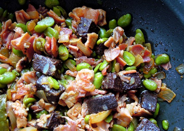 Habas a la Catalana (broad beans with Jamon Iberica and black pudding)