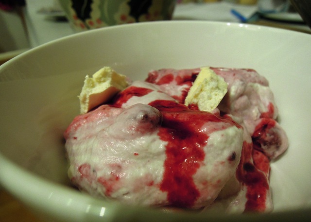 In this version I have used a mixture of frozen ‘winter berries’ from the supermarket – in this case blackberries, blackcurrants, cherries and grapes – and cooked them gently in a thick mulled wine syrup before combining with the cream and homemade meringue, flavoured with a little ginger. Take it from me, it tastes and smells divine. I was a little worried it might be a bit ‘grown up’ for my two daughters but they both chomped their way through it gleefully, and the oldest even had seconds.