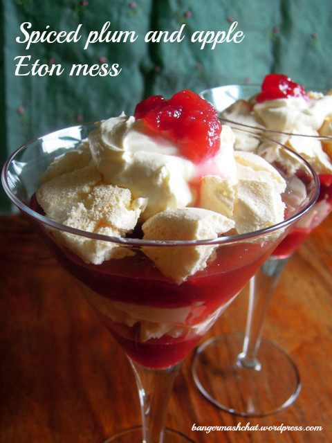 I made this festive version of an Eton Mess for our family gathering on Boxing Day and it got an all round thumbs up as an alternative to the traditional trifle I’d usually make. The stewed plum and apple is gently flavoured with cinnamon and star anise, and swirled into whipped cream along with crunchy-but-slightly-chewy chunks of meringue.
