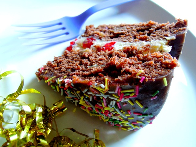 The chocolate birthday cake is very easy to make, especially if, like me, you’re not a natural-born baker. It’s the kind of cake that actually looks better if it’s not too perfect. Fill it with whipped cream and your child’s favourite soft fruit – we went with raspberries. Pour over the icing and cover liberally with sprinkles, Buttons, Smarties or whatever your little one’s favourite happens to be – this also happens to be the perfect way to disguise any imperfections.