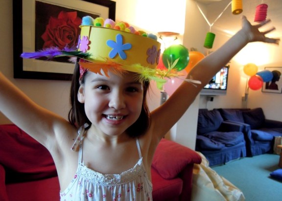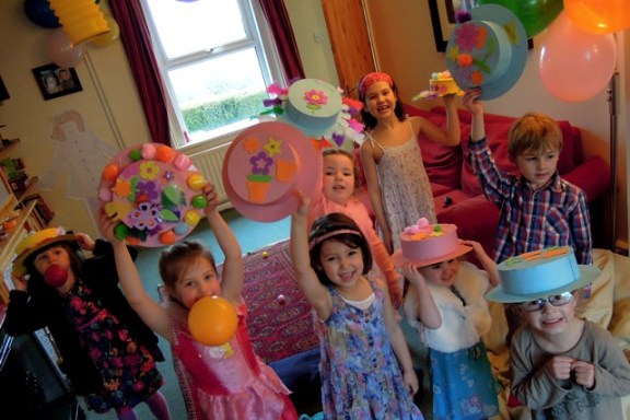 The highlights of our party were simple delights: playing with balloons, a messy chocolate cake covered in hundreds and thousands, fizzy flying saucers, old school games like pass-the-parcel and musical bumps, getting gluey making Easter bonnets, telling fart and poo and bottom jokes while gobbling chipolatas and party rings, and playing a new game we invented called pin-the-nose-on-the-Mia. Turning five is lots of fun!