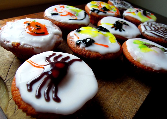 Once the cakes were cool, Miss Bangers and Miss Mash helped me to decorate them. Now I know it’s still a little way off, but my girls are already getting into the Halloween mood, so that was the theme for our decorations.