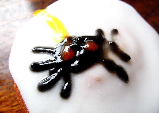 For the white icing, I sifted 150g icing sugar into a small bowl and added a tablespoon of water. This was mixed together, adding a touch more water as necessary, to form a thick smooth paste. We used coloured icing pens to draw on our spooky creations.
