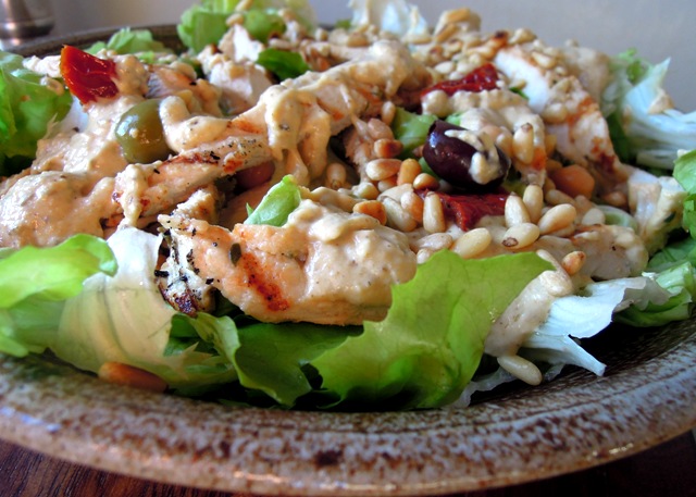 The other week I borrowed a recipe book from the local library called Make It Moroccan by Hassan M’Souli, and came across a tasty looking salad smothered in a hummus-based dressing. I’ve never thought of using hummus as an ingredient in anything before, so thought I’d give it a go. M’Souli’s original featured falafel and haloumi cheese but I’ve used marinaded chicken breast in my version instead, and it works a treat. The chicken breast is butterflied and cooked quickly in a griddle pan, so it is beautifully moist and succulent, while the hummus, chickpeas and toasted pinenuts give the salad a lovely, satisfying nuttiness.