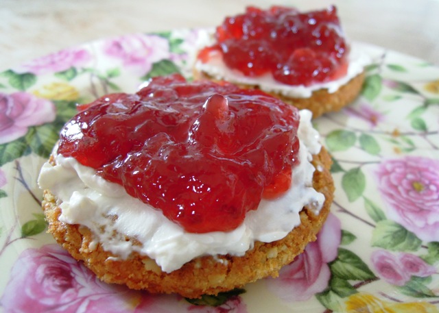 No recipe required here – simply take your biscuit of choice and spread with cream cheese, then top with strawberry jam or any other flavour jam you happen to have at your disposal. My girls, Jessie and Mia, made them with me after tea and they were a big hit all round.