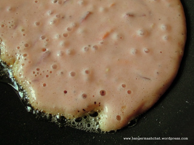 These pancakes are made from beetroot and carrot, although I’m sure if you did a blind taste test no-one would be able to guess. They simply taste good in a savoury, wholesome kind of way. I was rather hopeful the final pancakes would be pink like the batter. My girls would have loved that. But unfortunately the colour changed as the pancakes fried. Perhaps if you use only beetroot you end up with a stronger colour? I need to experiment some more, I think.