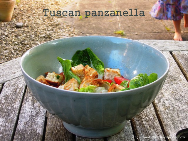 Panzanella is a tasty and satisfying Italian summer salad, perfect for picnics and eating al fresco. We enjoyed it last weekend when the sun was shining and it felt like we were on holiday in our own garden. The weather has sadly turned greyer and damper, but I am hopeful the blue skies will return. Hope, hope!