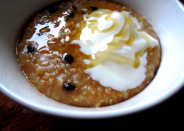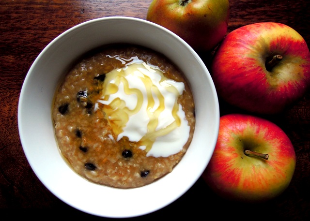 Porridge made with apple juice is my new favourite breakfast. It’s absolutely delicious and I feel just so virtuous eating it. I add currants, giving it a lovely crunchy fruitiness and mix in a little cinnamon, which of course goes so well with apple. Then I serve it with a decent dollop of yoghurt and a squeeze of runny honey. Perfect! The children like it too. But my husband’s a traditionalist and is sticking with his milk.