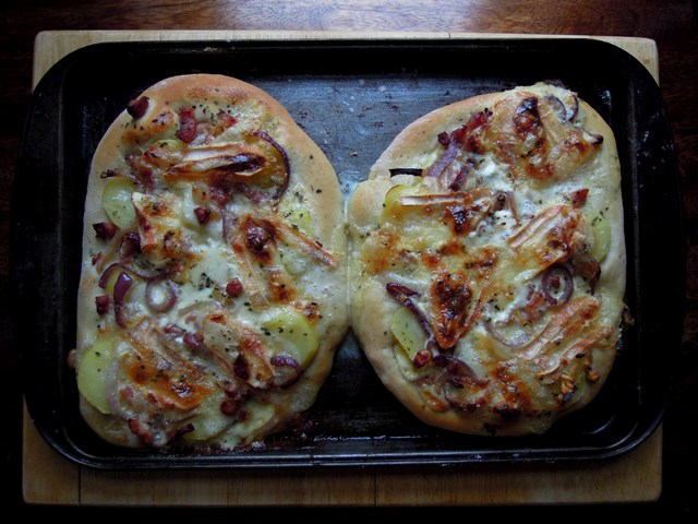 My recreation back at home worked well. I wasn’t 100% sure the children would cope with the cheese as it does have a rather strong taste, but they gobbled it down greedily. Potato may sound an odd topping for a pizza and this is certainly not a light pizza, but it is just so good with the oozy cheese and caramelised onion, making for a very satisfying meal.