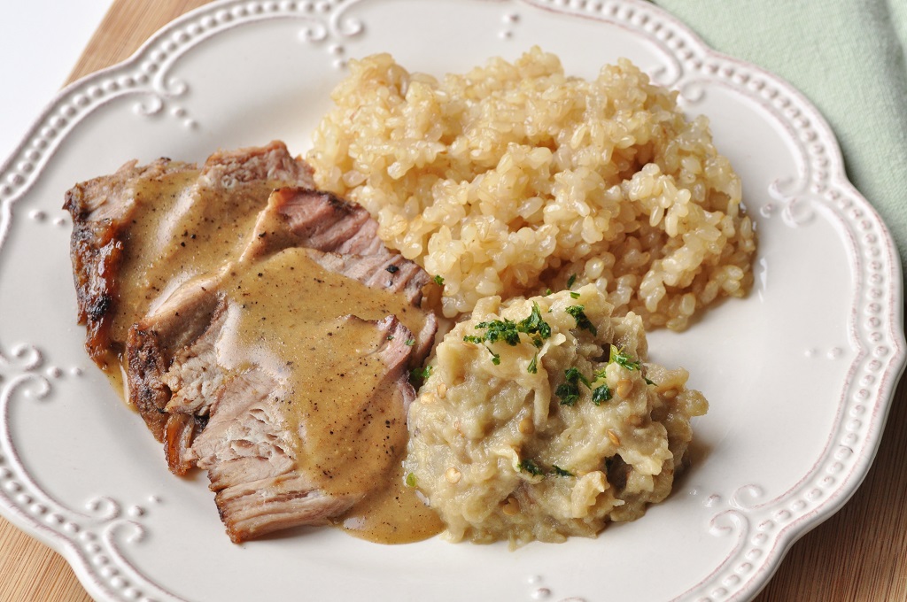 Lamb with aubergine is one of my all-time favourite combinations and so I was thrilled when I saw this next entry appear in my inbox. It’s a Mint-Cumin Roast Lamb with Moutabal from the extremely talented Lass in the Apron. The lamb looks incredible tender, while I adore the sound of the nutty, earthy moutabal, a Lebanese puree of roasted eggplant (aubergine) with tahini, garlic, and lemon.