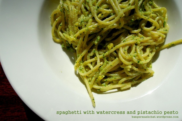 One of her suggestions was watercress, which is a particular favourite ingredient of mine. And so I came up with this recipe for watercress and pistachio pesto. I thought it might be a little peppery for the children but that wasn’t an issue at all. They wolfed it down and came back for more. A definite success. Bear in mind that if you do add the Ricotta at the end, you’ll need to use the pesto within a couple of days. If you leave it out, the pesto will keep in a glass jar in the fridge for a couple of weeks.