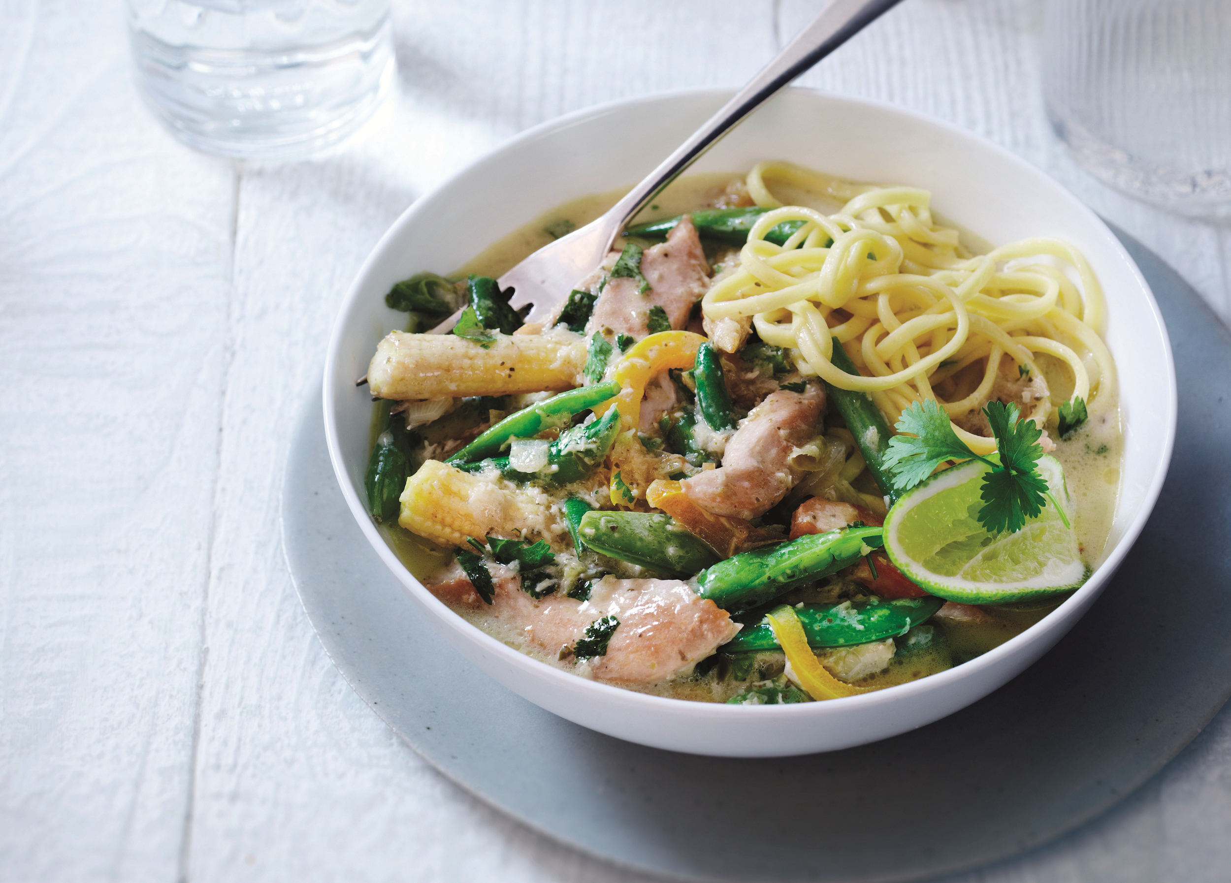 The chicken satay is packed full of spice and while it’s fine to mince the marinade ingredients in a food processor, I rather like doing it with a pestle and mortar to work out some of those pent-up tensions. It’s best to marinate the chicken overnight or at least for three to four hours.